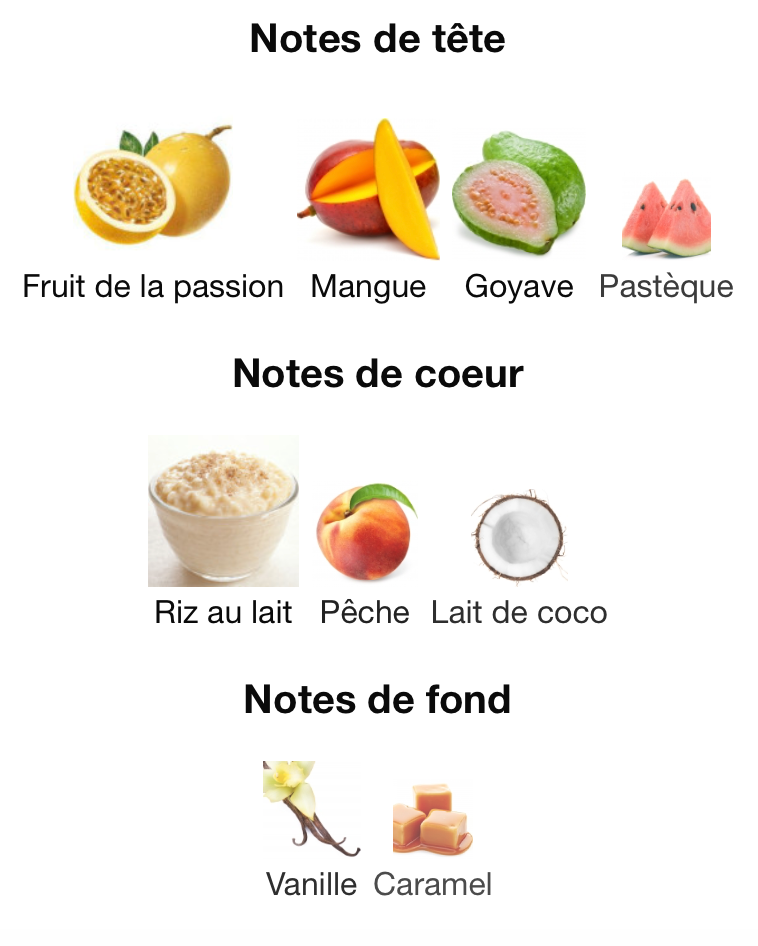 Au cœur de cette création envoûtante, la mangue gorgée de soleil déploie toute sa gourmandise tropicale, caressée par la douceur veloutée du riz au lait de coco. Dès la première inspiration, un éclat fruité et lumineux séduit instantanément, tandis que la pastèque juteuse et la goyave suave se fondent dans un accord délicatement rafraîchissant.